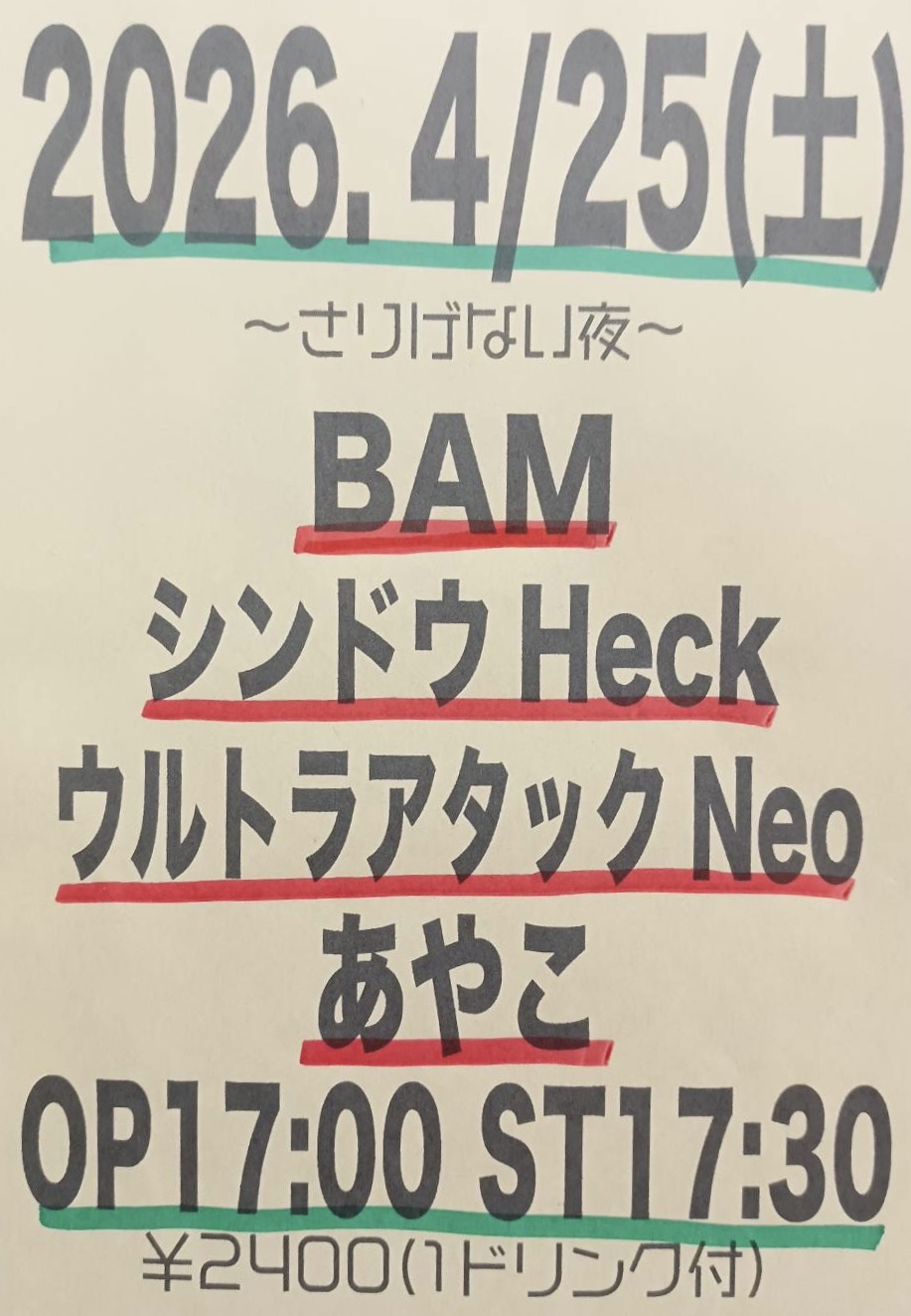 open 17:00 / start 17:30 /charge:¥2,400(1ドリンク付)